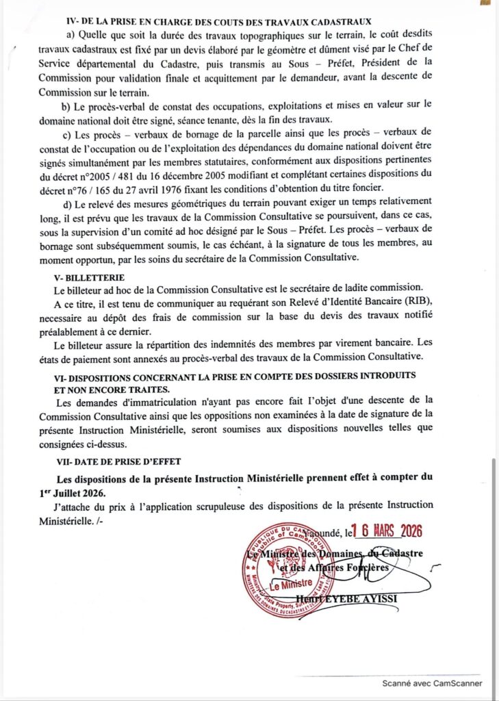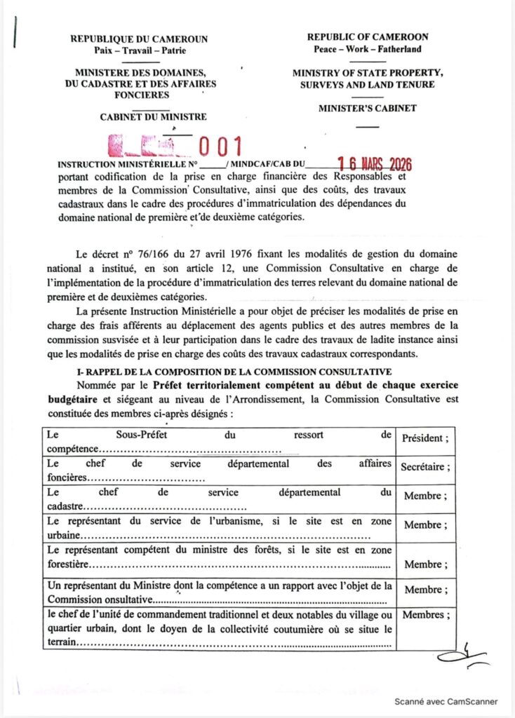 The Ministry of State Property, Surveys and Land Tenure has issued a landmark decision to regulate the financial aspects of land registration procedures. Ministerial Instruction No. 001/MINDCAF/CAB of March 16, 2026, establishes a clear framework for the financial responsibilities of applicants and opponents in the process of obtaining land titles (immatriculation) for land classified under the National Domain.